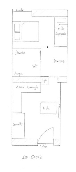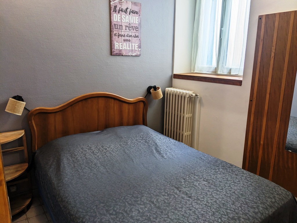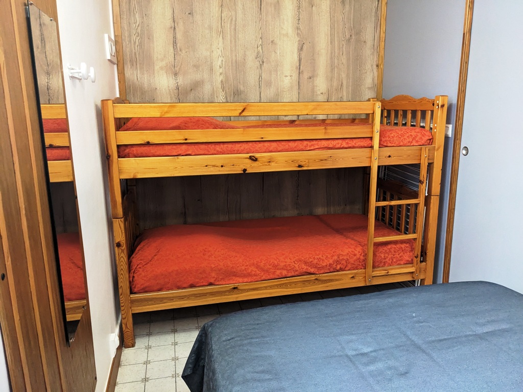 - 1 chambre : 1 lit de 2 places (140cm) + 2 lits superposés à 1 place (90cm), avec fenêtre située au nord donnant sur une cour anglaise
