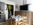 - pièce de vie avec 1 porte fenêtre située au sud : coin repas, banquette, téléviseur écrant plat, équipement cuisine : plaque de cuisson 2 feux (bouteille de gaz), évier 1 bac, réfrigérateur/congélateur, mini four, micro-ondes, cafetière, bouilloire, grille pain, batterie de cuisine...
